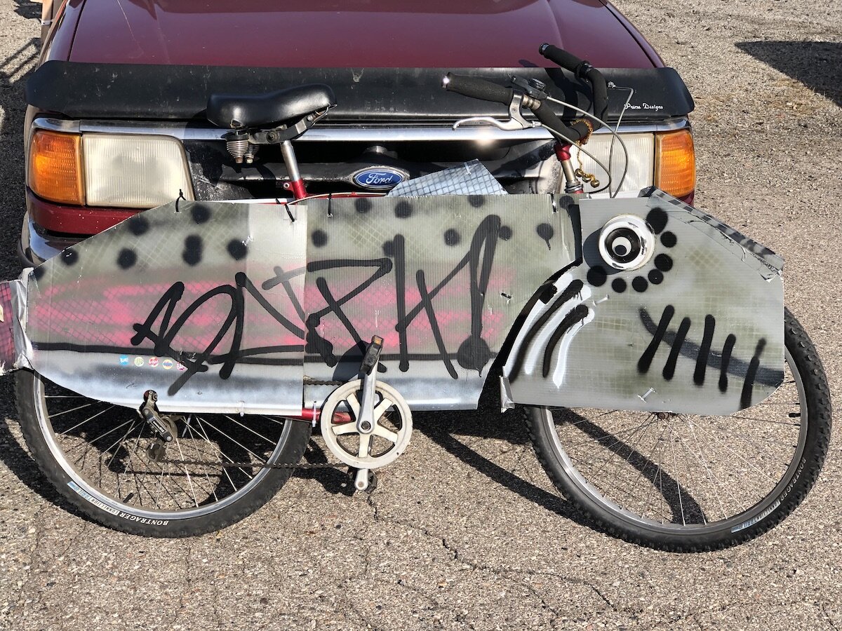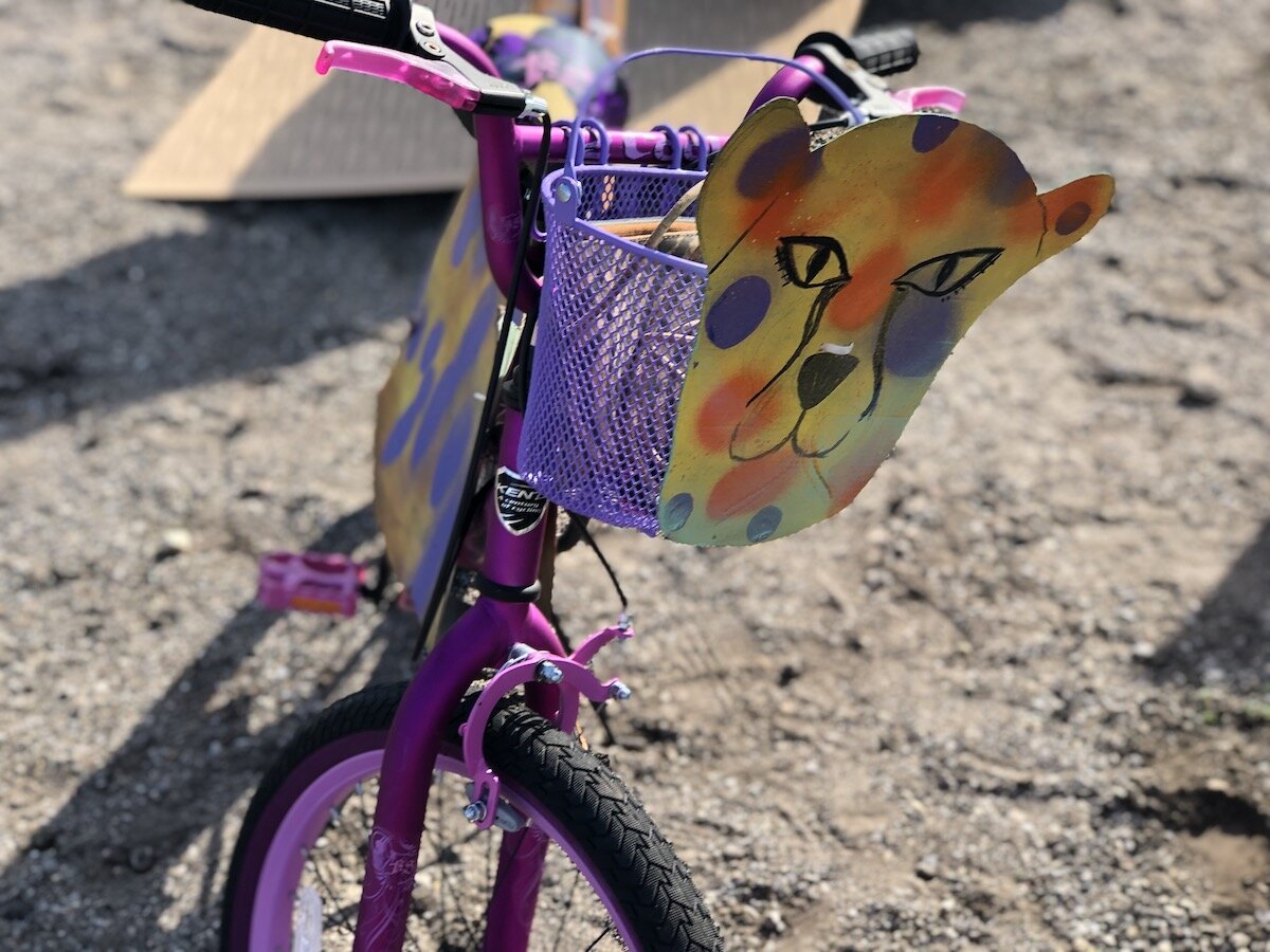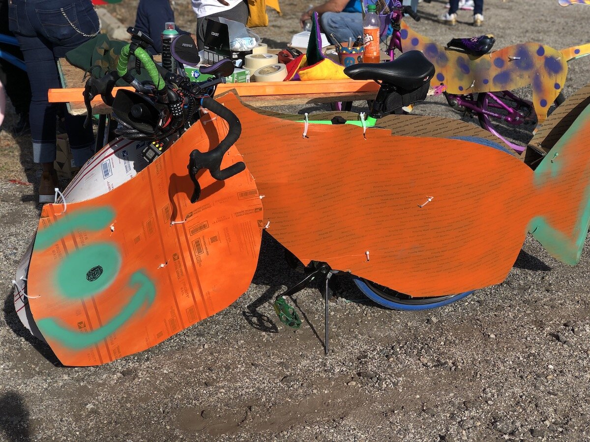 Ellard and a group of local artists, parents, and community leaders got together with a small group of kids to help them paint their bikes and design cardboard cutouts of fish, sharks, cheetahs, and other creatures. After the workshop, the cardboard pieces were then attached to the bikes, and kids did a Silly Bike Parade in the parking lot.