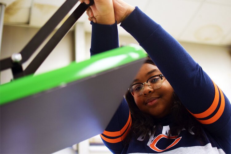 Flintside | Santiago Ochoa – McMillian gets ready to make a new print as she pushes down on the heat presses’ handle. This will be just one of the many shirts McMillian has designed using Southwestern Classical Academy’s new equipment.