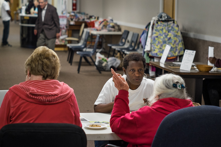 Men and women in St. Luke’s work programs complete 16 weeks of training—including computer training, working toward a GED, sewing, resume writing, problem solving, even exercise—as well as how to keep your job. Program participants then work for St. Luke’s for 90 days before the center starts trying to place them in a private sector job.