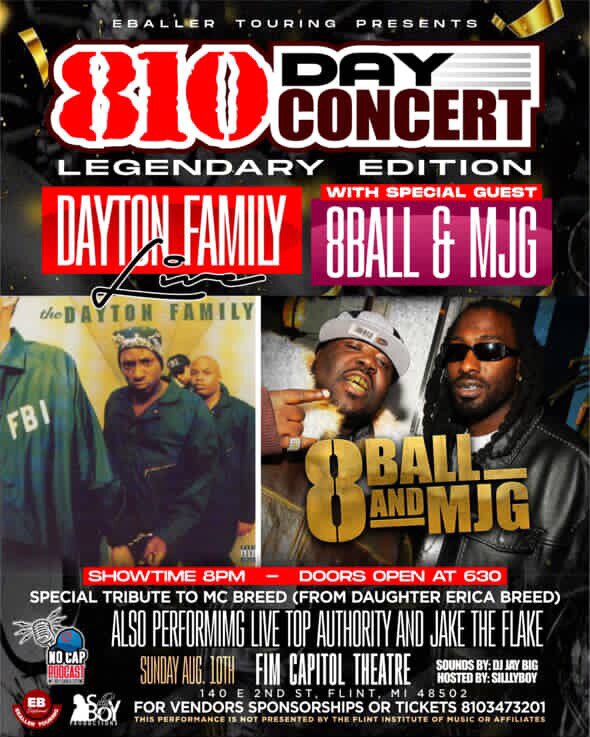 The lineup features veteran artists such as 8Ball & MJG, Top Authority, and Jake the Flake, as well as The Dayton Family. There will also be a tribute to late Flint artist MC Breed, performed by his daughter, Erica Breed, alongside MJ from Memphis.