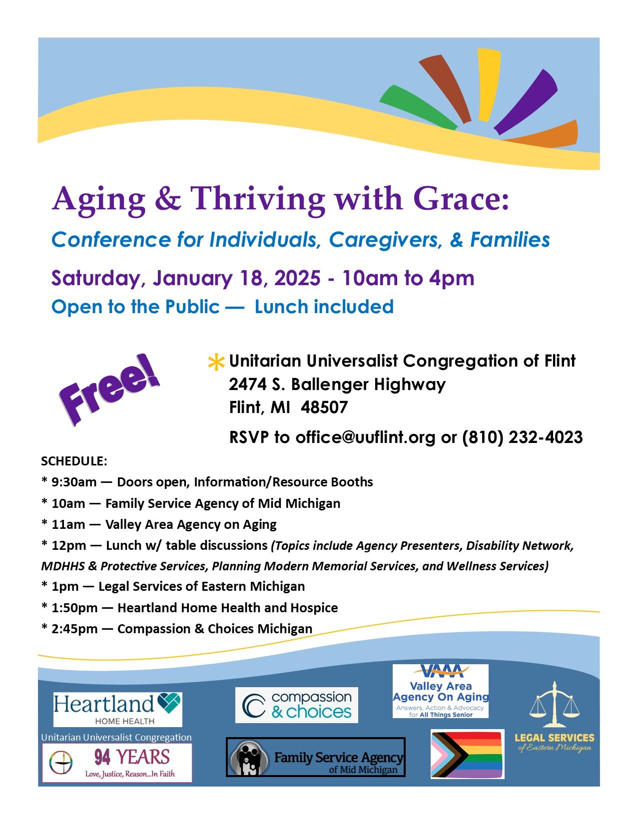 The Unitarian Universalist Congregation of Flint will host the free conference 'Aging & Thriving with Grace' on Saturday, Jan. 18, from 10 a.m. to 4 p.m. The event aims to empower attendees with knowledge and tools to navigate the complexities of aging, caregiving, and end-of-life planning.