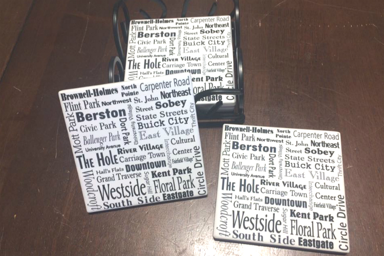 Inspired by all he saw, Conner developed the topic coasters. There are several coaster sets available. The one features Flint streets, but there are others featuring neighborhoods, leaders, antique postcard prints and old business advertisements.