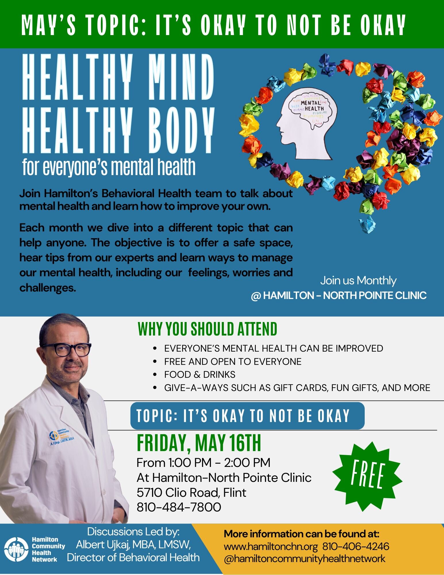 FLINT, Michigan — In recognition of Mental Health Awareness Month, Hamilton Community Health Network will host a free community discussion on Friday, May 16, titled ‘It’s OK to Not Be OK: Navigating Mental Health Together.’ Part of Hamilton’s ongoing Healthy Mind/Healthy Body Behavioral Health series, the talk will focus on breaking stigma, building support systems, and promoting mental wellness for all.