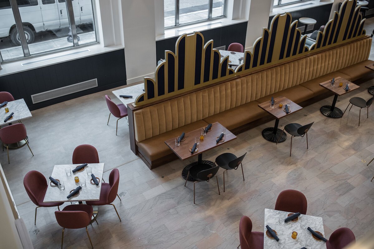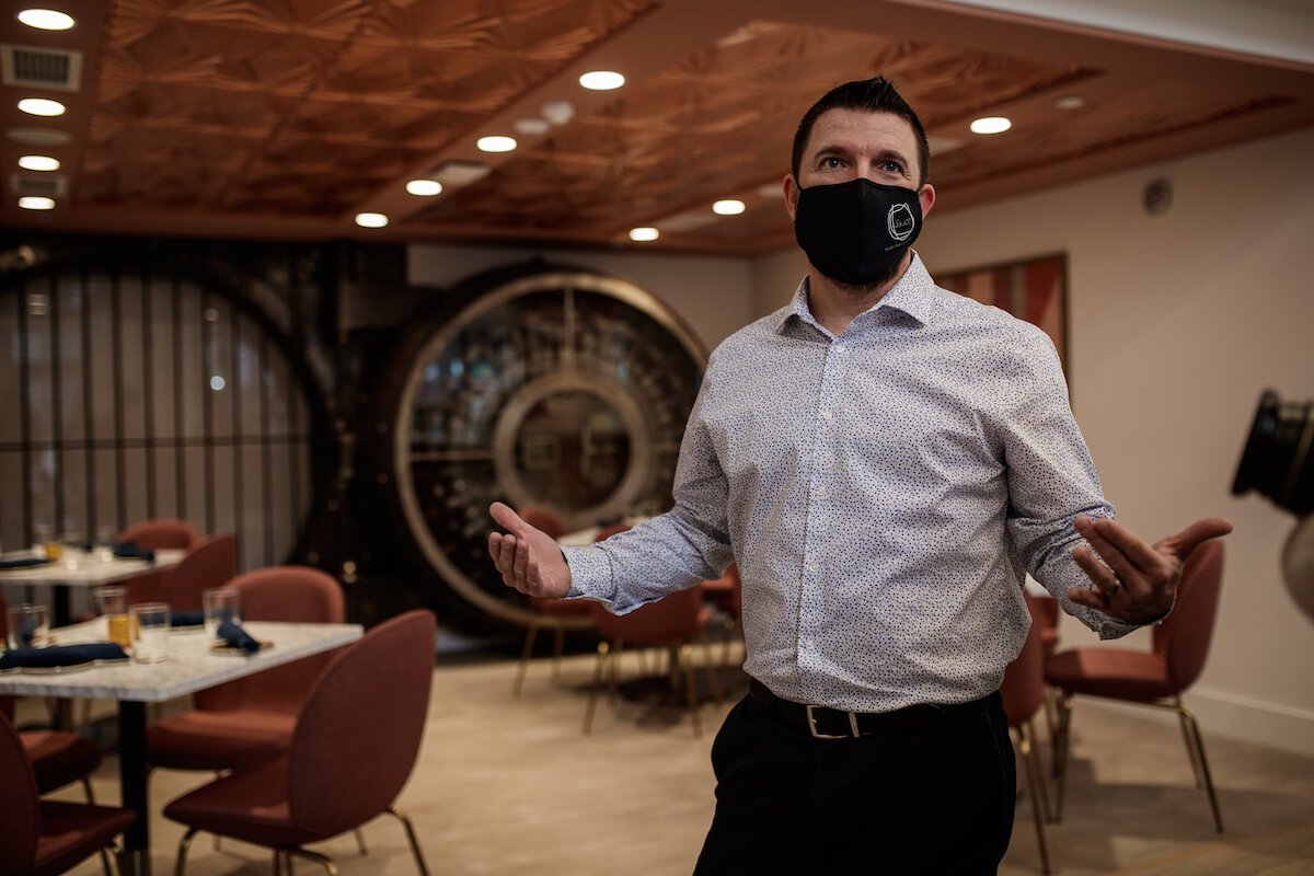 The entrance to Sauce features the old vault door of the original bank, with marble tables and countertops and a bar with a view of the lights on Saginaw Street. The restaurant has a mezzanine overlooking the first floor with the space and plans to host live music.